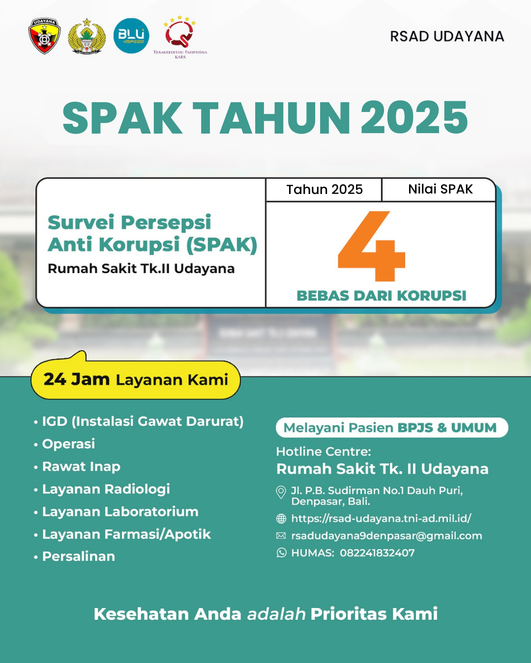 Rumah Sakit Tk. II Udayana di Denpasar, Bali, kembali menunjukkan komitmennya terhadap integritas dan pelayanan publik yang bersih. Melalui Survei Persepsi Anti Korupsi (SPAK)