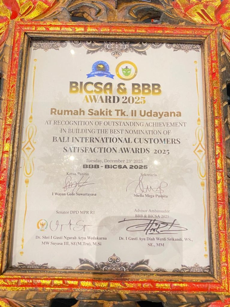 Rumah Sakit Tk. II Udayana kembali menorehkan prestasi membanggakan dengan meraih BICSA & BBB AWARD 2025 dalam ajang bergengsi Bali International Customers Satisfaction Awards. Penghargaan ini diberikan sebagai bentuk apresiasi atas pencapaian luar biasa rumah sakit dalam membangun nominasi terbaik di bidang kepuasan pelanggan layanan kesehatan.